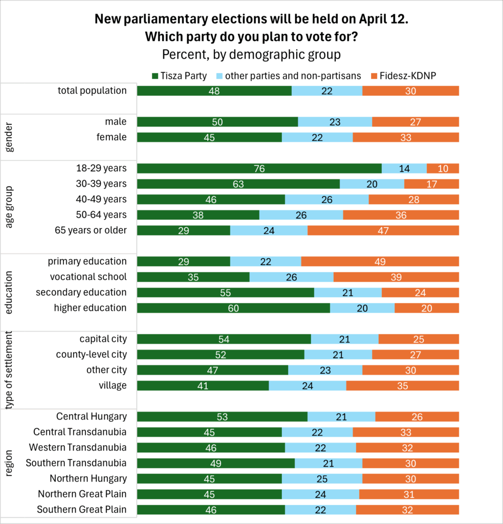 Differences by type of settlement are no longer as pronounced. It remains true that the larger the settlement, the higher the share of residents supporting Tisza, while the smaller the settlement, the more popular Fidesz is. Even so, in the March surveys Tisza is already ahead in villages as well, leading Fidesz by 41 to 35.