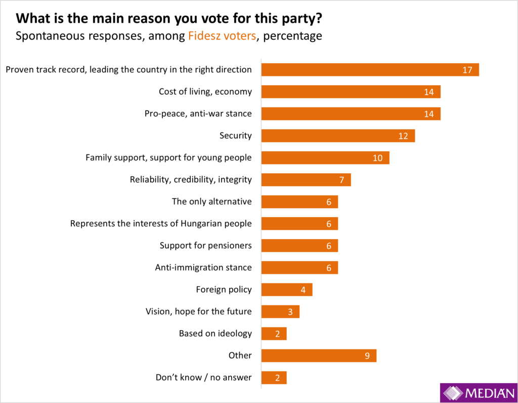 If we look only at the responses of Fidesz voters, the majority of them vote for the ruling party because they believe it has already proven that it is leading the country in the right direction: for 17 percent, this is the primary reason for their support of Fidesz. In second place—tied—are acceptance of the party’s rhetoric and economic reasons. Among the latter, most mentioned that they owe their own financial security to Fidesz. Many feel that they have never lived as well as they have in recent years. One in ten Fidesz supporters specifically mentioned support for families, while security was the main reason for 12 percent