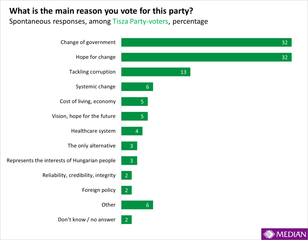 The motivations of Tisza voters are far less dispersed than those of Fidesz supporters. Thirty-two percent primarily back Péter Magyar’s party in order to bring about a change of government (with a further 6 percent explicitly calling for a systemic change), another 32 percent do so “in the hope of change,” and 13 percent because they expect a Tisza victory to eliminate corruption. No other reason exceeds 5 percent among Tisza voters, meaning that the overwhelming majority of supporters of the opposition grouping led by Péter Magyar are motivated primarily not by the party’s specific merits, but by opposition to the government.